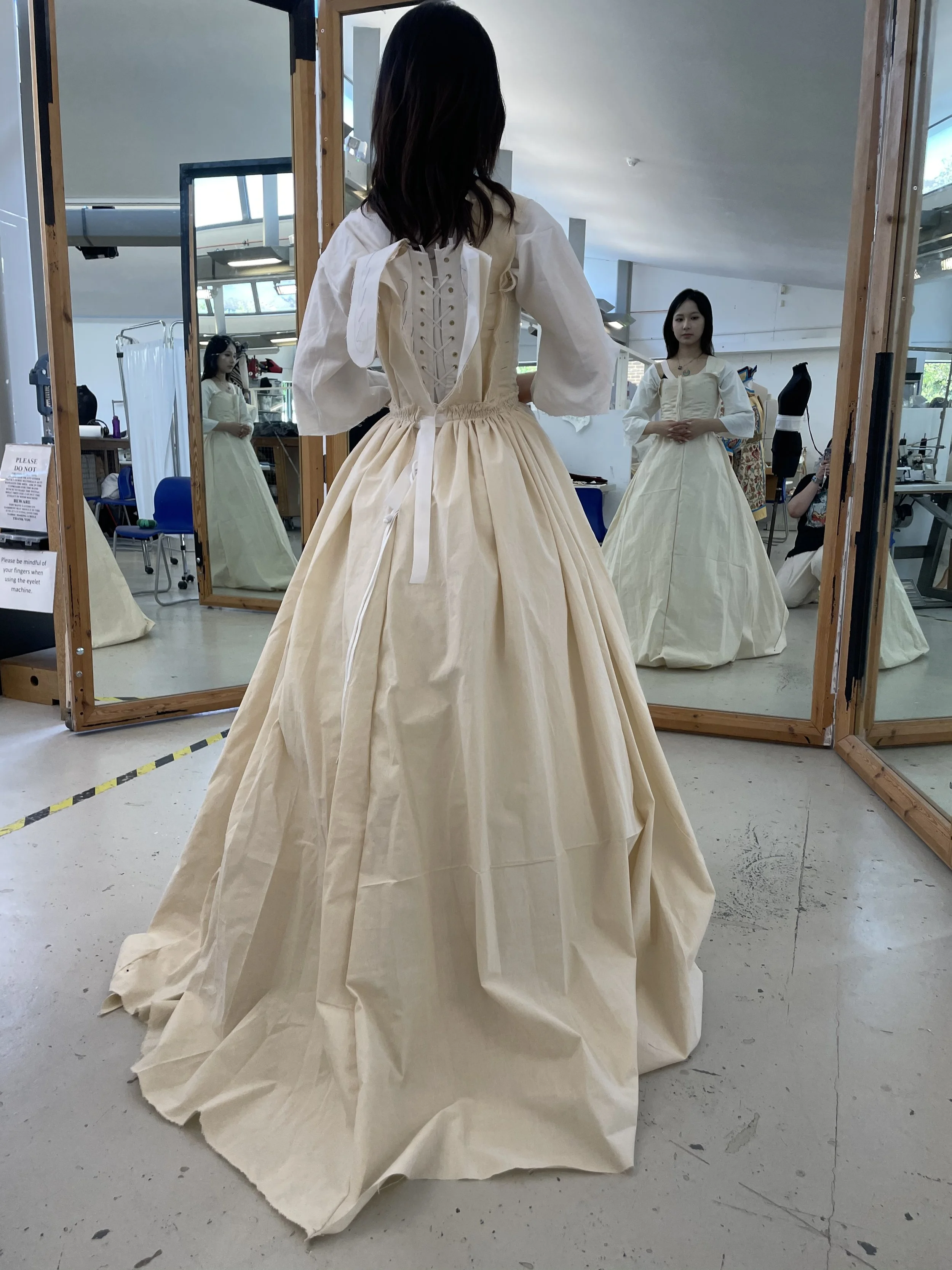The costume design was inspired by the painting behind, The Angel appears to Hagar and Ishmael. Silhouette from 1600s, Textile and printing inspired by narrative.